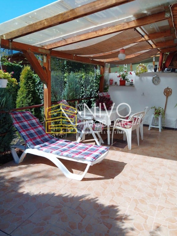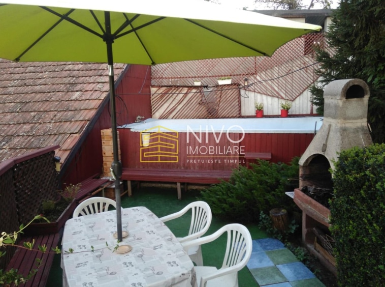 Curtea este amenajată și include garaj cu acces direct din stradă, magazie, zonă de grătar, piscină și pomi fructiferi.